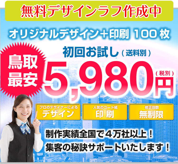 チラシデザイン+印刷で、税抜5980円鳥取県下最安値に挑戦!!チラシお急ぎ納期OK最短納期当日仕上げ対応中!! 鳥取県下同業他社より1円でも高い場合はご相談ください!!誠心誠意対応させて頂きます。チラシのことなら鳥取チラシ作成.com!