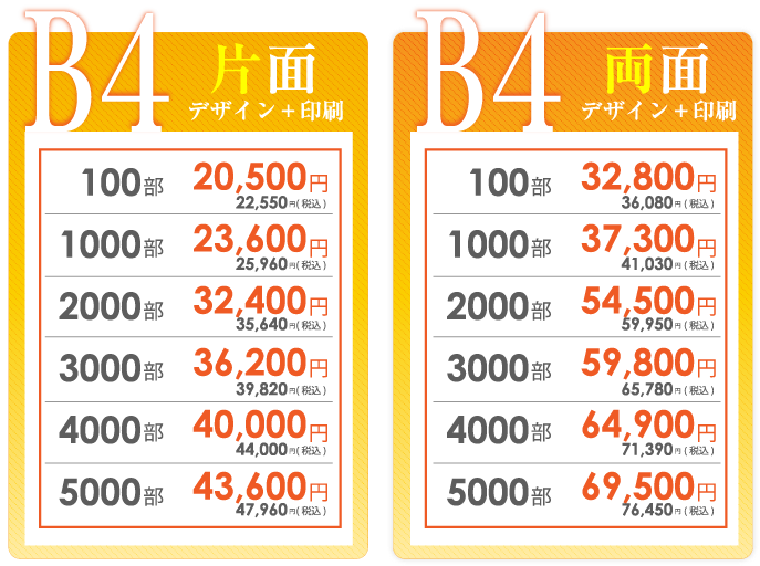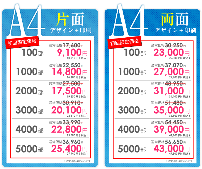 チラシデザイン作成、制作の強み 弊社の一番の強みは、低価格でハイクオリティーなチラシデザインの作成です。一般的な地元鳥取のデザイン会社ですと、チラシデザイン代片面で3万~4万が相場だと思います。 確かに安い業者はあるのですが、クオリティー的にプロとは言えないレベルのデザインの作成をし、一万円以下で販売もしている業者もいますが、対応のスピードや作品の質に疑問を感じます。鳥取チラシ作成.comではデザイナー全員が数年間の実務経験を経験しているデザイナーを多数抱えている為、低価格でのデザイン制作が可能になりました。 制作依頼前にラフデザインをご依頼者様に提出する為、お客様のイメージにより近いチラシのデザインを作成しております。よくお会いしてチラシデザインの打ち合わせをしたいというお客様もいらっしゃいますが、弊社は低価格での提供を考えておりますのでやり取りは、電話やメール、FAXなどで対応しております。また、 修正などもお客様がご納得していただくまで、何度でもチラシデザインの修正を承っております。 続いて、チラシデザインの制作スピードに関しましても、最短で当日・翌日仕上げの特急便、2~3日で完成するお急ぎ便の2種類をご用意しております。 チラシデザインの特急便はA4サイズの場合、片面34000円~でお受けしております。チラシデザインのお急ぎ便は片面25500円~でお受けしております。お急ぎの場合は、是非弊社の担当者までお気軽にお問合せいただければ幸いです。 スピードを求めないのでしたら、弊社で1番のお勧めはチラシ印刷パックをオススメしております。一番安いプランですと、チラシデザイン+印刷でA6サイズ100枚で税抜5980円からオススメしております。A4サイズでの最安パックは、チラシデザイン+印刷+送料込みで100枚で9,100円でお受けしております。 また他に何かわからないことがございましたらなんなりとお気軽にお問合せください。
