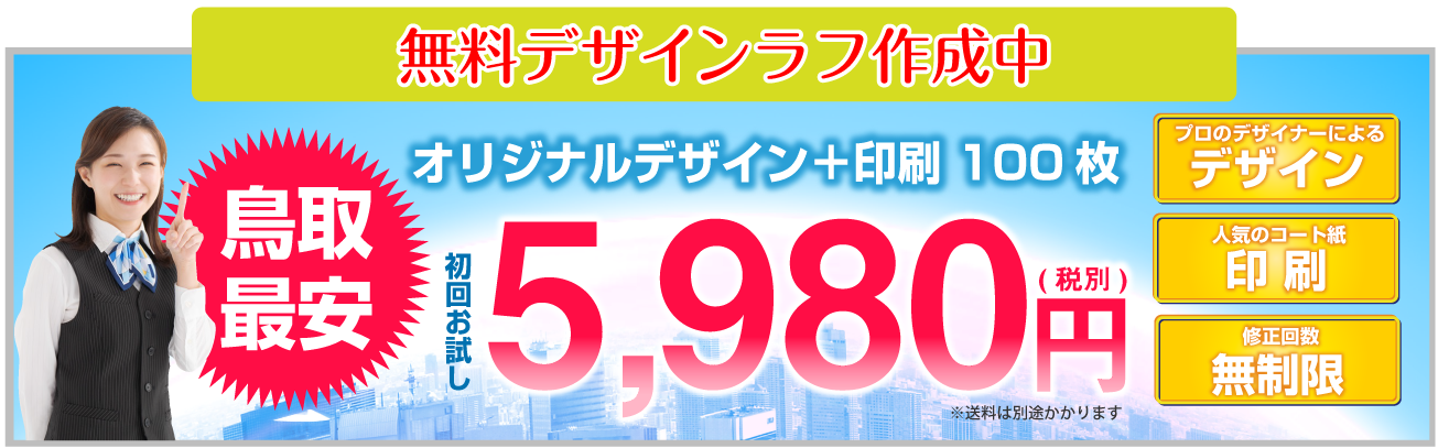 チラシデザイン+印刷で、税抜5980円鳥取県下最安値に挑戦!!チラシお急ぎ納期OK最短納期当日仕上げ対応中!! 鳥取県下同業他社より1円でも高い場合はご相談ください!!誠心誠意対応させて頂きます。チラシのことなら鳥取チラシ作成.com!